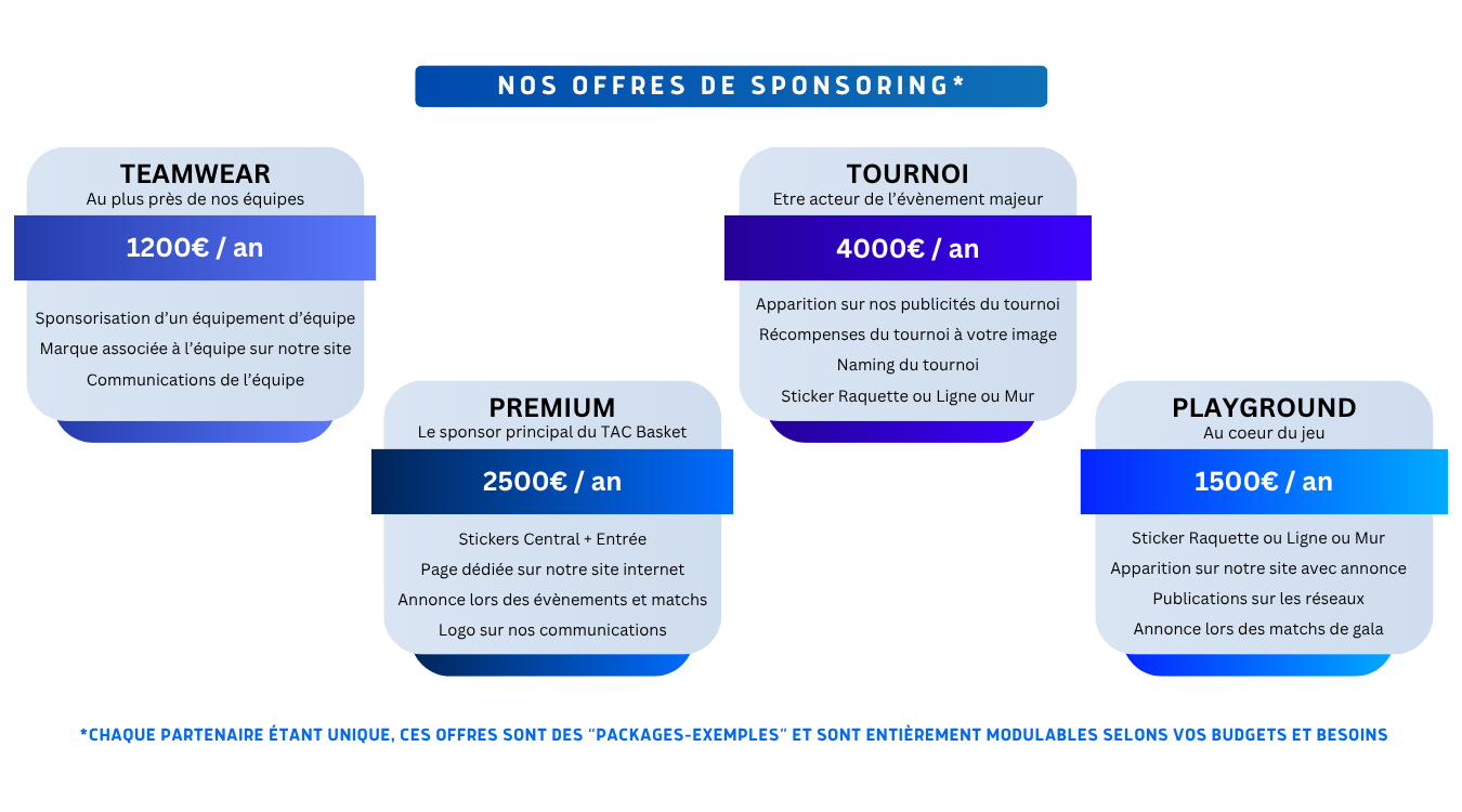Défilez cette page pour découvrir comment nous soutenir et en quoi les partenariats sont importants pour le TAC Basket, mais également pour vous partenaires :